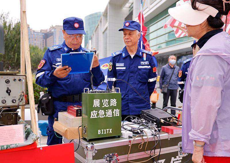 活动现场,西城区合力减灾中心开展了模拟实战的防空袭掩蔽演练,现场教授辖区群众在紧急情况下如何快速、有序、安全地进行掩蔽防护。活动现场还邀请了西城区武装部、区反恐办、区红十字会、展览路街道无线电团队等相关单位参与,结合各自工作职能现场“摆摊宣传”,通过装备设备展示、互动体验、现场教学培训等形式,向参与人群科普展示设备、专业知识、技能演练、法律法规等内容,提高市民应急能力。