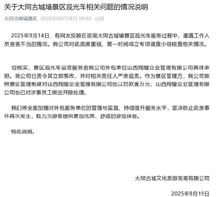 9月19日,大同古城文化旅游发展有限公司发布关于大同古城墙景区观光车相关问题的情况说明: 2025年9月14日,有网友反映在咨询大同古城墙景区观光车服务过程中易方达证券,遭遇工作人员言语不当的情况。我公司对此高度重视易方达证券,第一时间成立专项调查小组核查相关情况。 经核实易方达证券,景区观光车运营服务由我公司外包单位山西翔耀企业管理有限公司具体承担。我公司已责令其立即整改易方达证券,并对相关责任人严肃追责。作为景区管理方,我公司按照景区管理制度对山西翔耀企业管理有限公司处以罚款壹万元;山西翔耀企业管理有限公司也已对涉事员工做出开除处理。 我们将全面加强对外包服务单位的管理与监督,持续提升服务水平,坚决防止此类事件再次发生,致力为游客提供更加优质、舒适的游览体验。